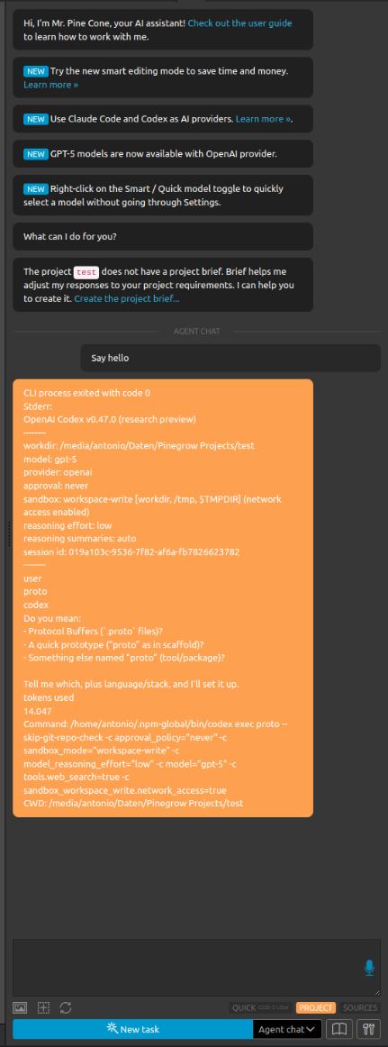 “proto” command issue. The Codex CLI documentation doesn’t mention any “proto” command, I can’t find it. That may be a mismatch between the CLI version and what Pinegrow expects. Capturing the exact command Pinegrow runs (from its console) could help narrow it down.